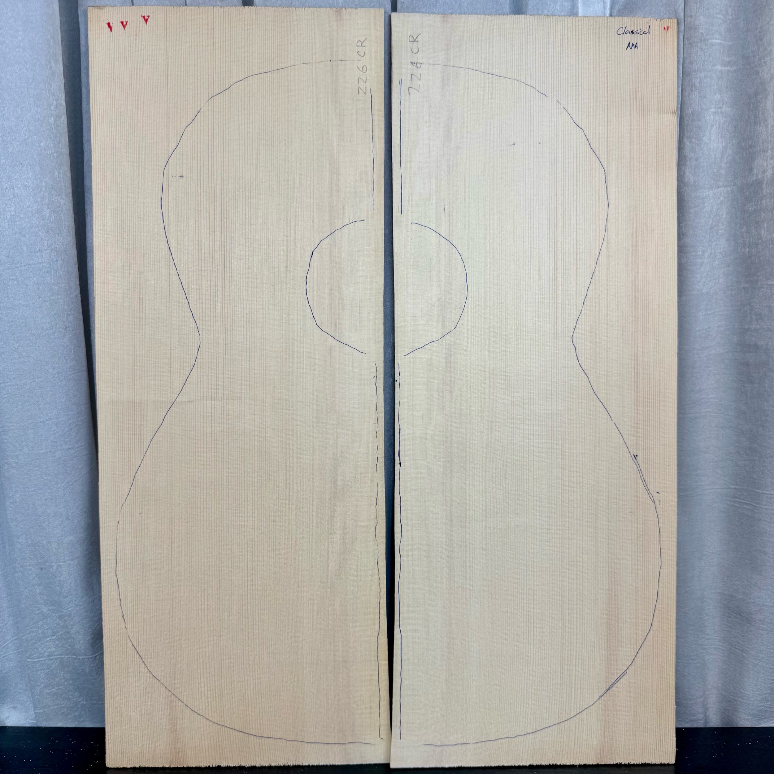 Master grade is a traditionally beautiful top without any defects, narrow even grain across the top and cross grain is very stiff. Sold as a book matched set. Request a specific log number or characteristic.